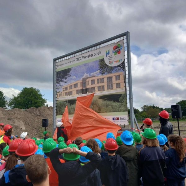 In het bijzijn van alle leerlingen en teamleden is het bouwbord van OKC Weisterbeek in Horst onthuld. Zij kregen van het bouwteam, bestaande uit SORS adviesgroep, Muller Bouw, Bevers installatie en Herlings elektro techniek, een eigen bouwhelmpje cadeau.