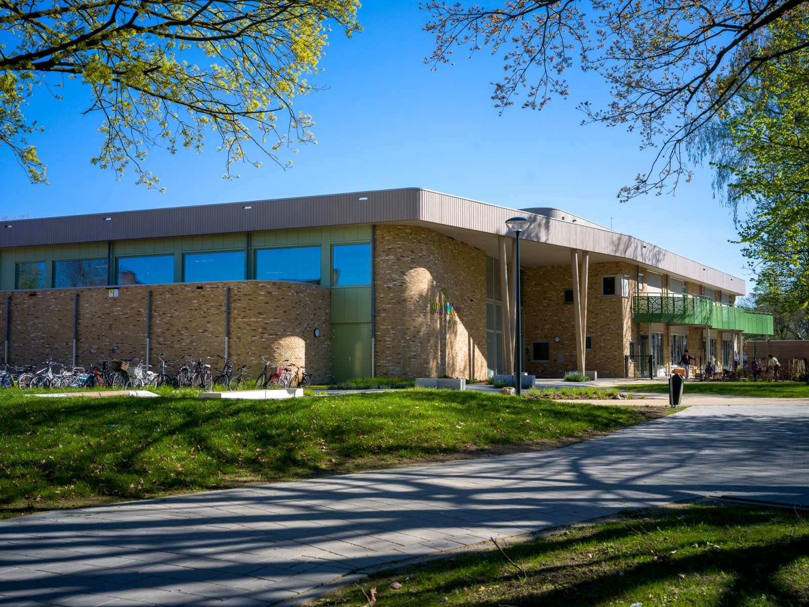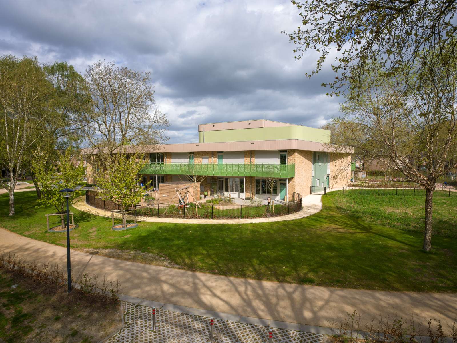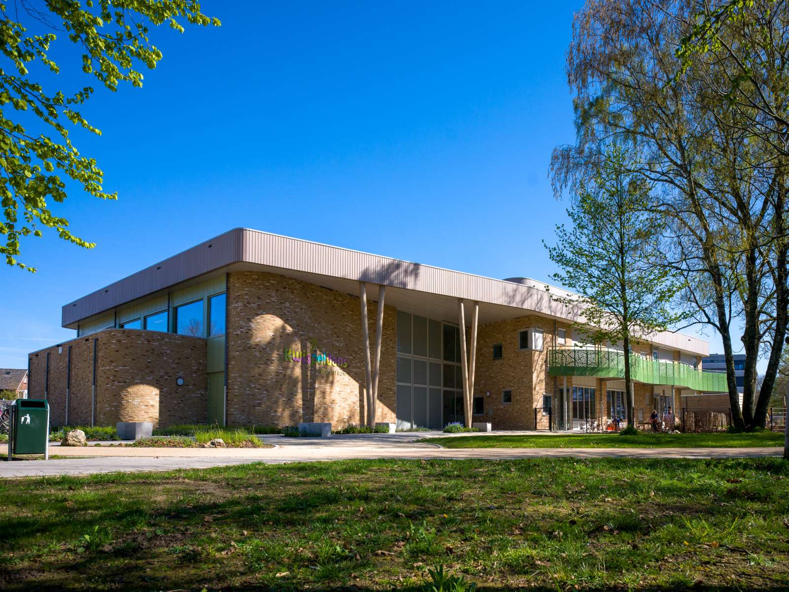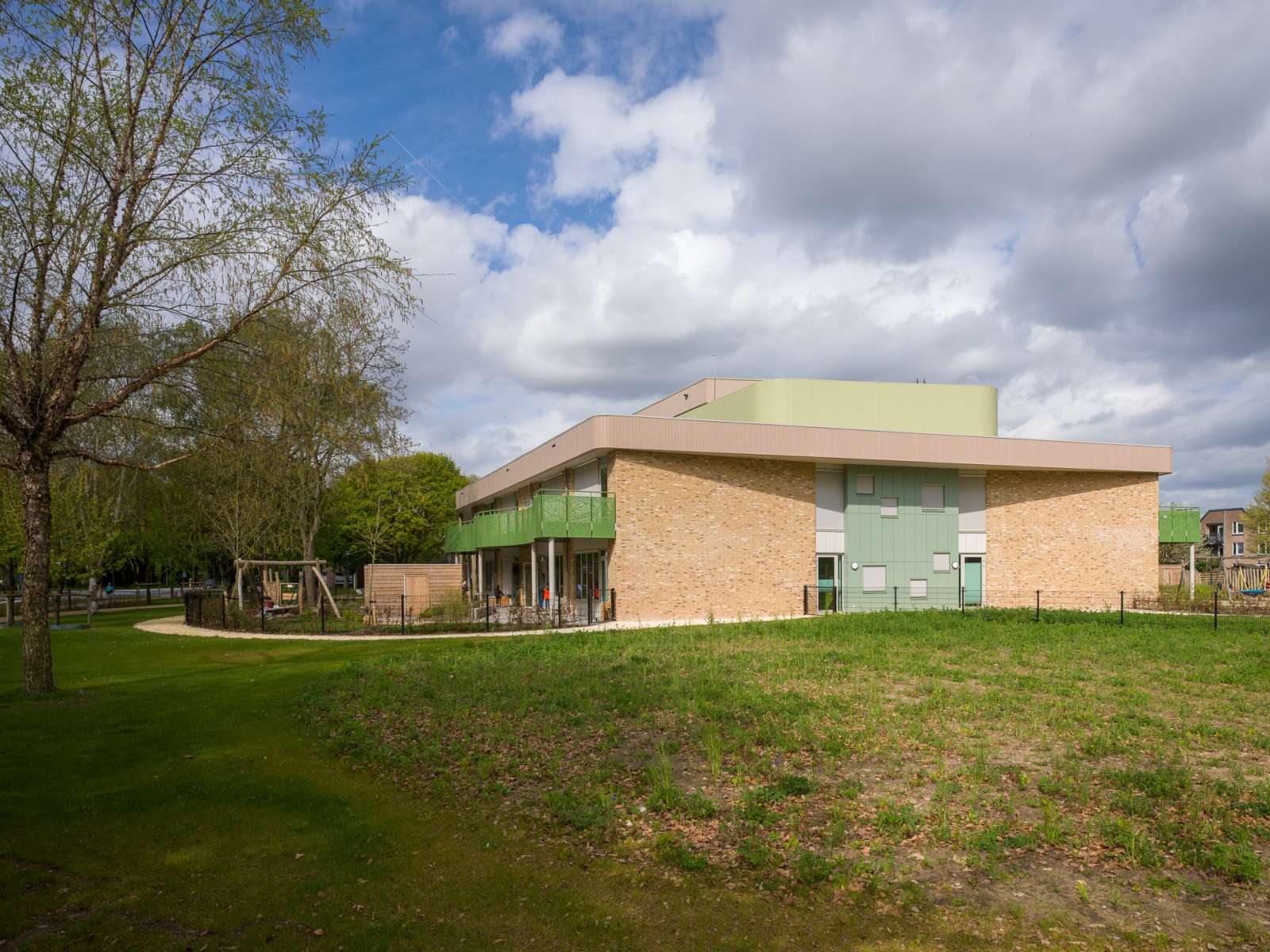 Het nieuwe Kindcentrum is een moderne, energiezuinige en natuur inclusieve school. Een vriendelijk alzijdig gebouw met een kenmerkende balustrade op de eerste verdieping waar de kinderen vanuit hun klas naar buiten kunnen. Hiermee zijn zowel op de verdieping als op begane grond leer-, speel- en werkplekken binnen direct gekoppeld met buiten. Het onderwijsgebied wordt op deze manier vergroot. Het gebouw sluit aan bij de parkachtige omgeving van sportpark de Wieën en de openbare ruimte rondom het kindcentrum. Het hart van het gebouw wordt gevormd door de huiskamer, centrale hal met bibliotheekfunctie en de patio. Daaromheen zijn drie metselwerkvolumes positioneert met daarin onderwijs-, kantoor- en sportfuncties. De volumes zijn zodanig gepositioneerd dat de ruimte hiertussen een heldere structuur creëert waarmee eenvoudig is in te spelen op multifunctioneel gebruik, overdag en in de avond. Het geheel wordt bij elkaar gehouden onder een dak.